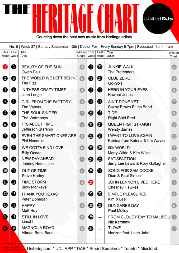 “Out Of Time”- being released Sept 18 - moved up two spots to #10 this week on the Heritage Chart Monday, 14 September 2020 21:15 Read: 2333 Times Print Email Prev Next Tweet Please login/register in order to post a comment
